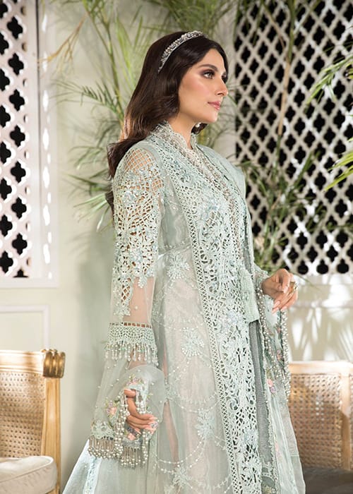 Straight long shirt with embroidered neckline border and sleeves paired with matching pants with embroidered border and embroidered dupatta