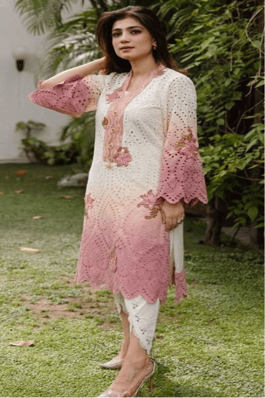 Straight long shirt with embroidered neckline border and sleeves paired with matching pants with embroidered border and embroidered dupatta